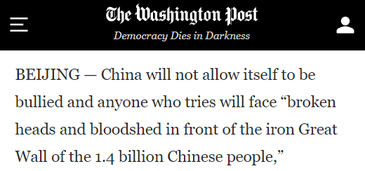 华盛顿邮报:中国不会再被人欺负,谁妄想这样干,必将在14亿多中国人民用血肉铸成的钢铁长城面前碰得头破血流。