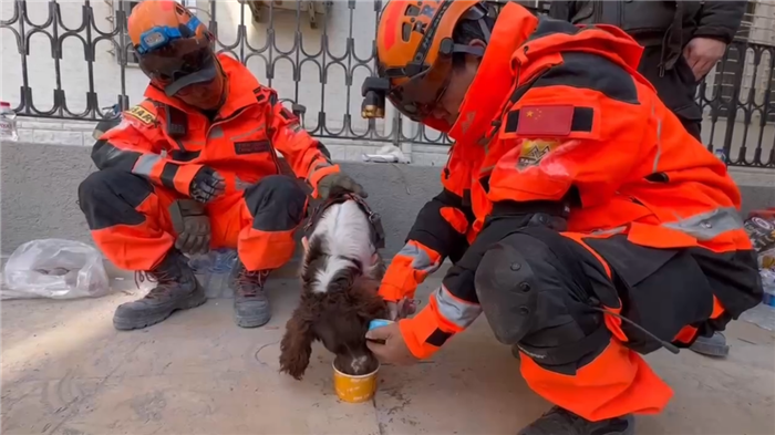 搜救犬Lucky已经连续参与现场作业超过三天。为保障最佳状态,救援间隙需要及时为它补充水份和食物。搜救犬训导员高之江在一旁默默安抚Lucky,寸步不离,等待一起重返“战场”。搜救犬不仅是我们的重要伙伴,更是亲密“战友”!