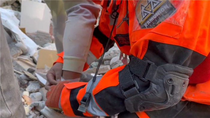 公羊救援队队员为土耳其作业人员现场进行简易包扎。视频截图