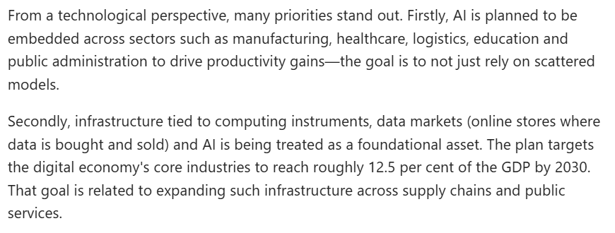 文章认为,首先,人工智能被规划融入制造业、医疗、物流、教育及公共管理等领域,以提升生产力,其目标是不再局限于零散的应用模式。其次,与计算设备、数据市场及人工智能相关的基础设施,正被视作一种基础性资产。规划纲要提出,“十五五”时期数字经济核心产业增加值占国内生产总值比重达到12.5%。这一目标与在供应链及公共服务领域扩展此类基础设施密切相关。