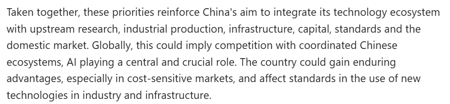 文章进一步分析说,这些优先事项强化了中国将其技术生态系统与上游研究、工业生产、基础设施、资本、标准及国内市场相融合的目标。对全球而言,这意味着未来将面对一个高度协同的中国技术生态系统,而人工智能将是这一系统的中枢。中国由此可能获得持久的竞争优势,同时也会在工业及基础设施的新技术应用标准方面发挥越来越大的影响力。
