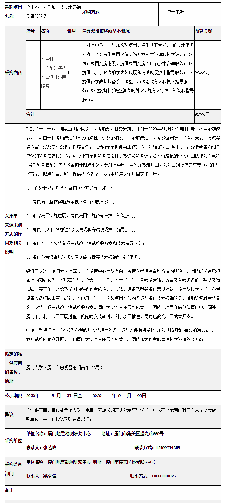 “电科一号”加改装技术咨询及跟踪服务单一来源采购公示