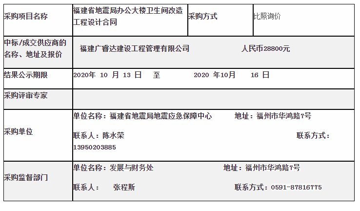 福建省地震局办公大楼卫生间改造工程设计采购结果公告
