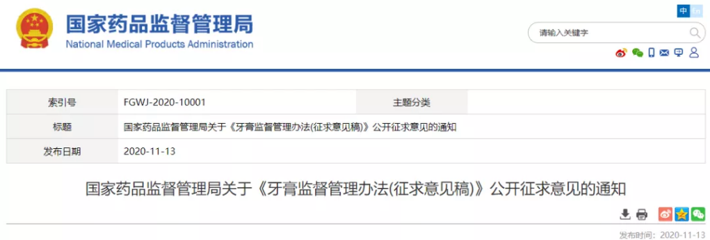 11月13日,国家药品监督管理局发布关于《牙膏监督管理办法(征求意见稿)》(下称“办法”)公开征求意见的通知。