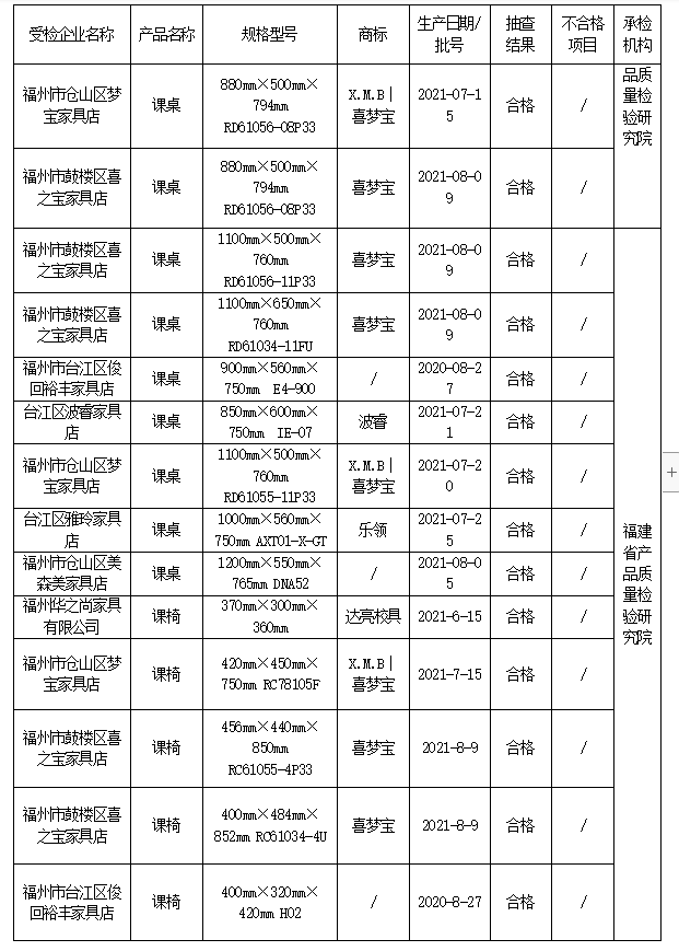 课桌椅的安全性一直是学校家长社会关注的重点,由于学生每天直接接触使用其安全性必须得到充分的保证。有的课桌椅存在危险锐利尖锐物安全隐患,有的课桌椅产品低价甲醛释放量超标,导致学生头晕、头痛等,很容易给孩子们带来伤害。 根据市场监管总局关于开展消费品质量安全进校园活动的要求,近期,福建省市场监管局依据《产品质量法》,组织对学生课桌椅产品质量开展省级监督抽查。共抽查7家销售单位的课桌10批次产品、7家销售单位的课椅10批次产品。 本次抽查依据QB/T 4071-2010 《课桌椅》标准的要求,对课桌的安全性、桌面垂直静载荷、桌面垂直耐久性、桌面垂直冲击、桌腿跌落、桌面水平静载荷、重金属含量(限色漆)、甲醛释放量等8个项目进行了检验;对课椅的安全性、椅子向前倾翻、椅子侧向倾翻(有扶手和无扶手)、椅子向后倾翻、凳子任意方向倾翻、座面椅背联合静载荷、座面侧向静载荷、椅腿向前静载荷、椅腿侧向静载荷、座面冲击、椅背冲击、踏脚静载荷、椅腿跌落、枕靠侧向静载荷、扶手侧向静载荷、重金属含量(限色漆)、甲醛释放量等17个项目进行了检验,未发现不合格产品。 合格产品信息表