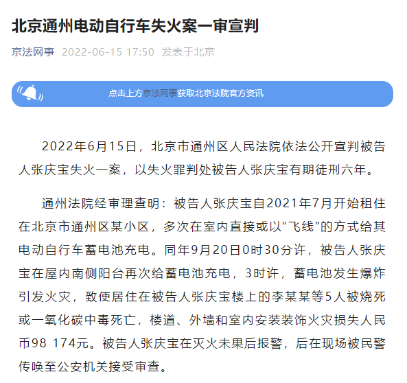 有期徒刑6年!北京通州电动自行车失火致5人亡案一审宣判
