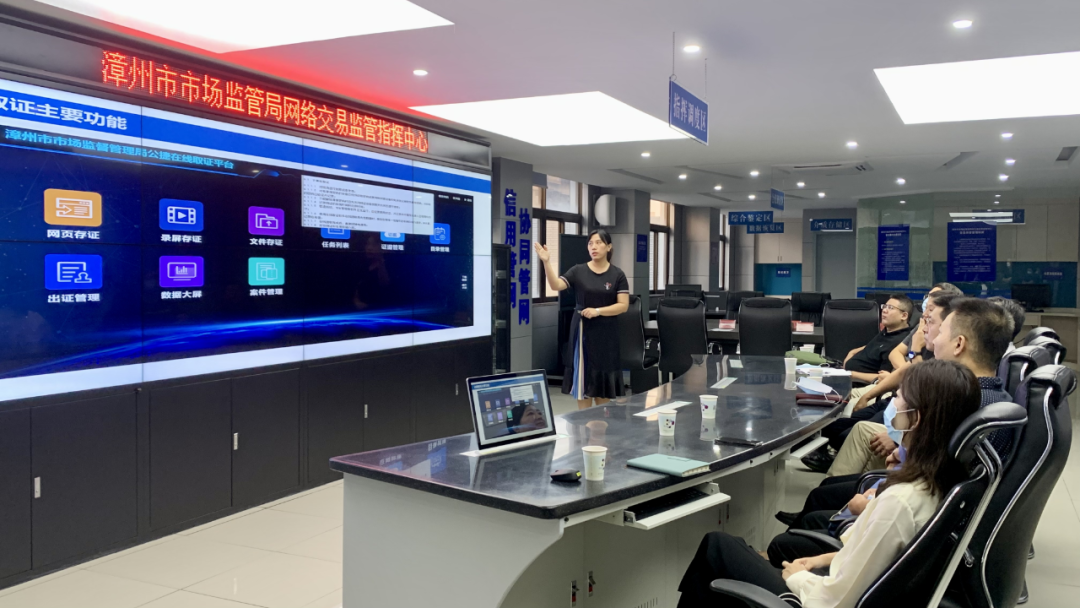 调研组首先参观了漳州市局网络交易监管指挥中心。网监分局同志汇报了市市场监管局开展国家总局电子数据取证“双试点”的工作成果,系统全面地展示了市局自主研发的公捷取证平台、凌波联盟链。现场演示环节,市局执法人员熟练操作了电脑端网页存证、录屏存证、文件存证和移动端录屏存证等电子取证流程,高效准确地展示出电子取证结果。