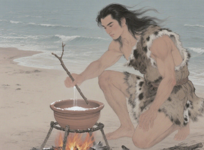 有一天夙沙在海边煮鱼吃,他和往常一样提着陶罐从海里打半罐水回来,刚放在火上煮,突然一头大野猪从眼前飞奔而过,夙沙见了岂能放过,拔腿就追,等他扛着猎物回来,发现罐里的水已经熬干了,罐底留下了一层白白的细末。