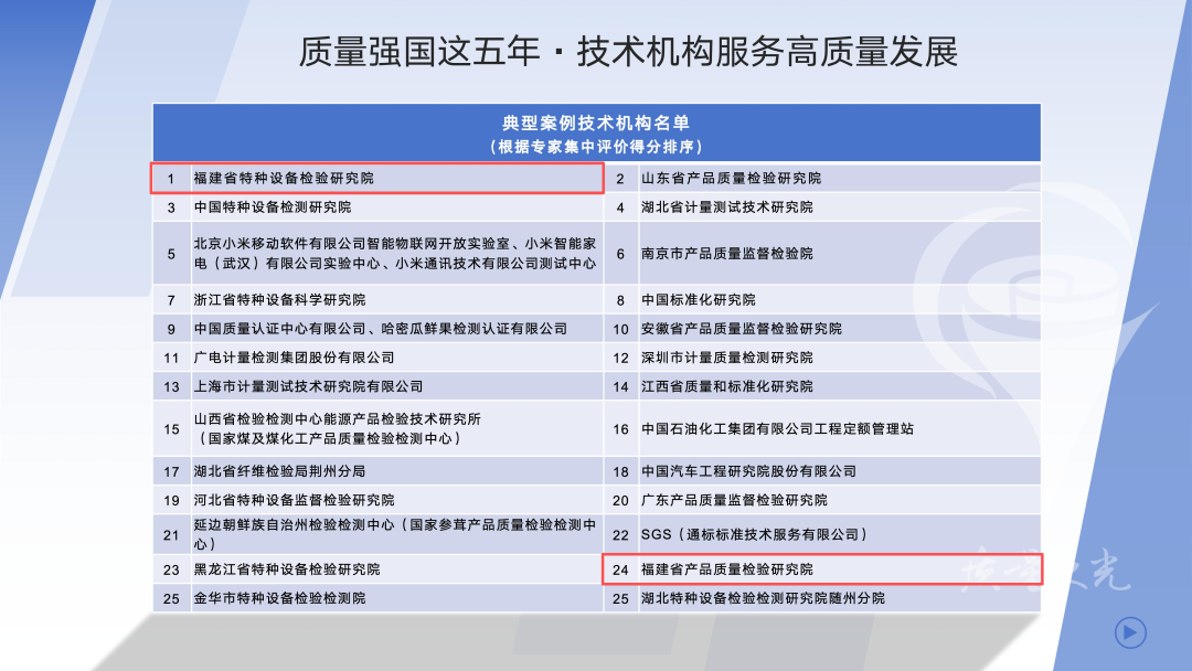 论坛现场发布了“十四五”时期十大质量新闻及“质量强国这五年·技术机构服务高质量发展”典型案例。其中,由省市场监管局组织推荐报送的福建省特检院《扛旗守护特安生命线》案例、福建省质检院《技术赋能福安按摩器具产业提质增效》案例成功入选“质量强国这五年·技术机构服务高质量发展”典型案例。