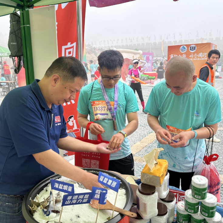 在补给站,莆田盐业不仅为每位参赛选手的参赛包配备福建贡盐,传递科学用盐、健康运动理念;更精心准备了盐焗鹌鹑蛋、电解质水、淡盐水,以高品质的“闽盐”帮助选手快速补充电解质、恢复体能、缓解运动疲劳。