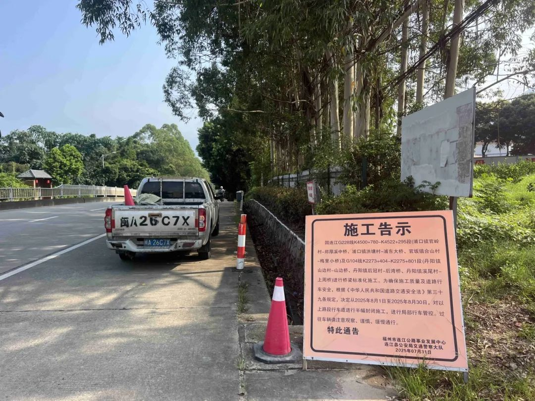 施工公告 上述桥梁因长期运营,部分结构出现不同程度病害,如桥面铺装及伸缩缝损坏、锥坡局部破损、桥上管线布设混乱等,不仅影响行车安全,也制约了道路通行品质。为全面提升桥梁运行的安全性与耐久性,营造畅通安全的交通环境,连江公路中心将对这六座桥梁开展预防性养护和标准化整治,工程计划工期为一个月,预计8月底完工。工程完工后,将有效提升六座桥梁的结构稳定性与通行舒适度,进一步保障国道G104线连江丹阳段、国道G228线连江浦口段的交通安全与畅通,为推动区域经济发展、保障群众安全便捷出行提供坚实支撑。 施工期间,连江公路中心将严格督促施工单位落实保通措施,严密组织现场安全布控,确保道路通行安全;同时严把施工质量关,落实各项安全与环保措施,全力打造品质工程、平安工程。在此,提醒过往车辆和行人:施工期间,请严格按照交通警示标志减速慢行,共同保障交通安全与道路畅通。(图片由连江公路中心提供) |