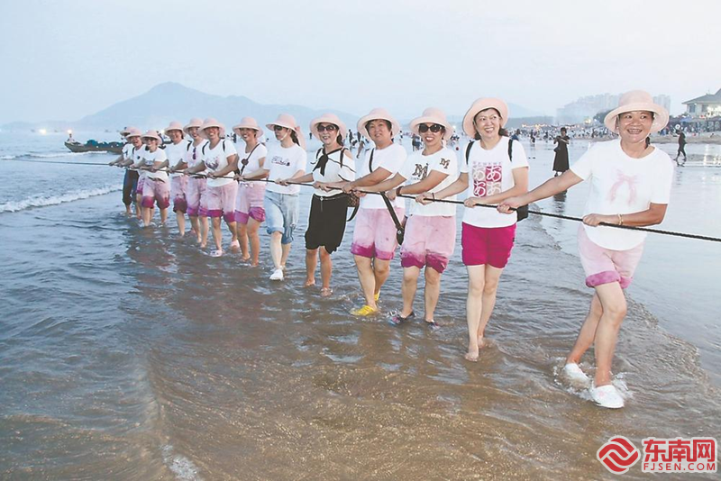 24日傍晚,游客参与东山渔民拉山网捕鱼活动。谢汉杰 摄
