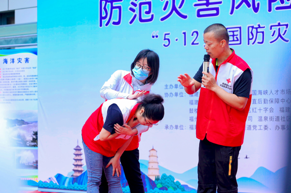 活动现场,驻省应急厅纪检监察组和省退役军人事务厅领导为社区居民代表发放急救包;省减灾中心向东大社区赠送《台风知识与应急避险》绘本;福建省红十字现场救护培训中心的老师们现场互动教授创伤包扎方法和气道梗阻急救法(海姆利克急救法)。