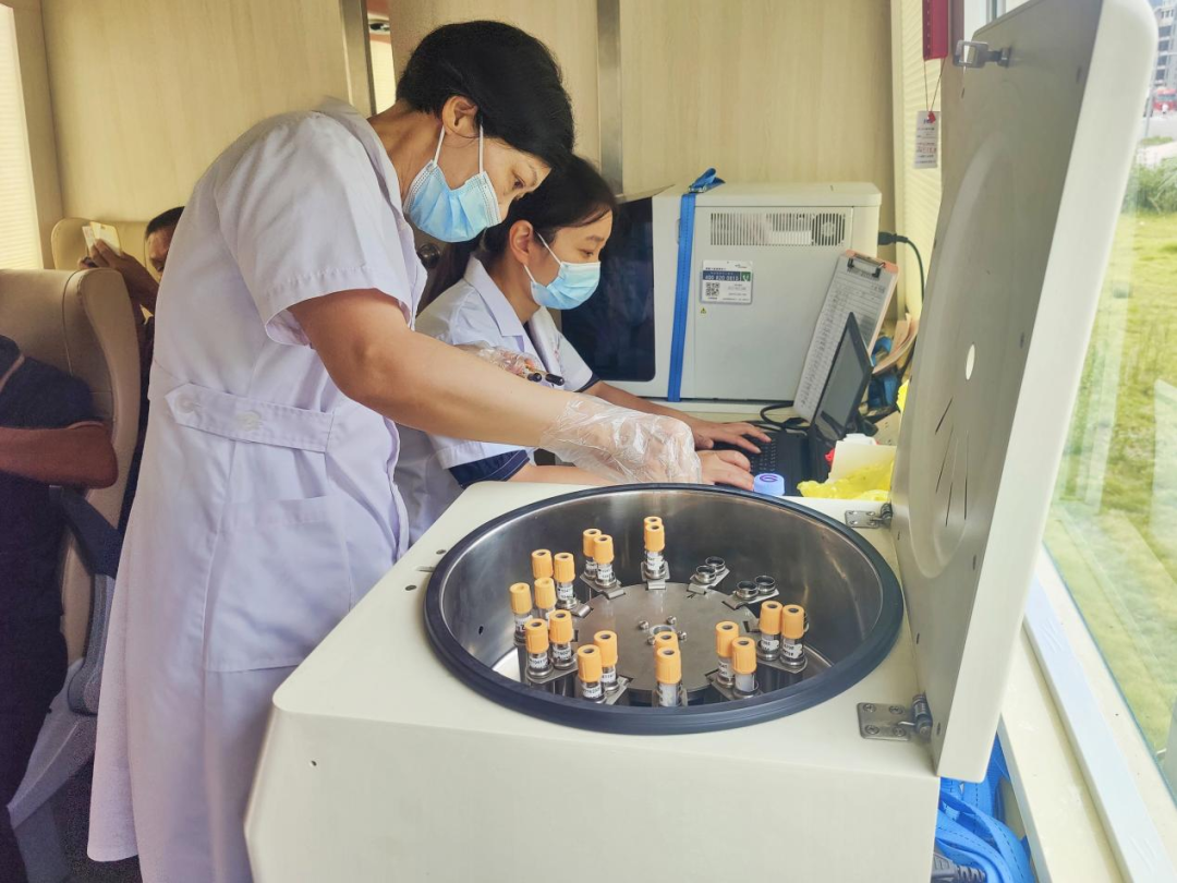 工作人员正在巡诊车上进行血液标本的前期处理