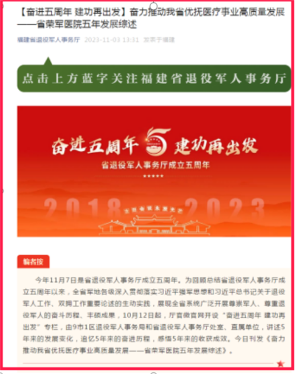 11月6日下午,在省退役军人事务厅10楼会议室,省退役军人事务厅成立五周年专题座谈会正在举行。厅领导、退休厅领导代表、机关各处室、驻榕所属单位主要负责人和驻闽部队官兵代表、基层退役军人者代表、退役军人代表齐聚一堂,纷纷畅谈五年来的工作心得和体会,以简朴而又热烈的形式共同回顾总结过去五年的发展实践,交流、研讨未来的发展大计,动员激励全体干部职工以更加昂扬的奋斗姿态和更加饱满的工作热情,引领和推动我省退役军人工作再创新业绩。 2023年11月7日,省退役军人事务厅成立五周年,组织专题座谈会是省退役军人事务厅在组建5周年之际开展“五个一”系列活动的其中一项。连日来,省退役军人事务厅还开展了其他4项活动,共同回顾五年来全省系统创业的历程。 组织一场“军民情”讲坛