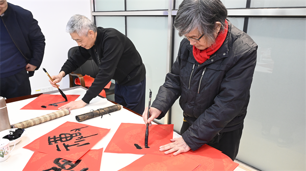 “全家平安添百福,满门和顺纳千祥”“一元复始龙增岁,万物生辉燕扳春”……活动现场红联铺张,墨香弥漫,书法家们下笔如行云流水,或苍劲有力,或秀气内敛,将浓浓的情谊和真诚的祝福洋溢在字里行间。不一会儿,一张张带着美好祝愿的“福”字,一幅幅寓意吉祥的春联便呈现在大家面前。前来迎春纳福的干部职工们络绎不绝,感受这份独特的文化关怀,同时认真挑选心仪的对联和“福”字,互相交流其中的寓意,现场一派欢乐祥和的气氛。