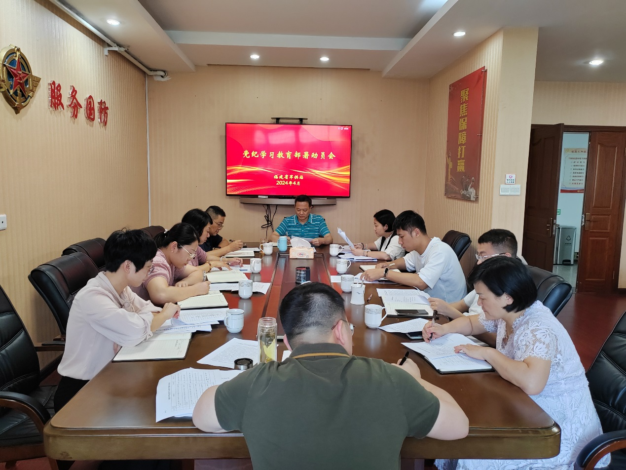 4月15日,福建省军供站召开党纪学习教育部署动员会。站支部书记站长主持会议并讲话。支部纪检委员传达党纪学习教育相关会议精神,介绍我站《关于开展党纪学习教育的工作实施方案》。站全体党员干部参加会议。