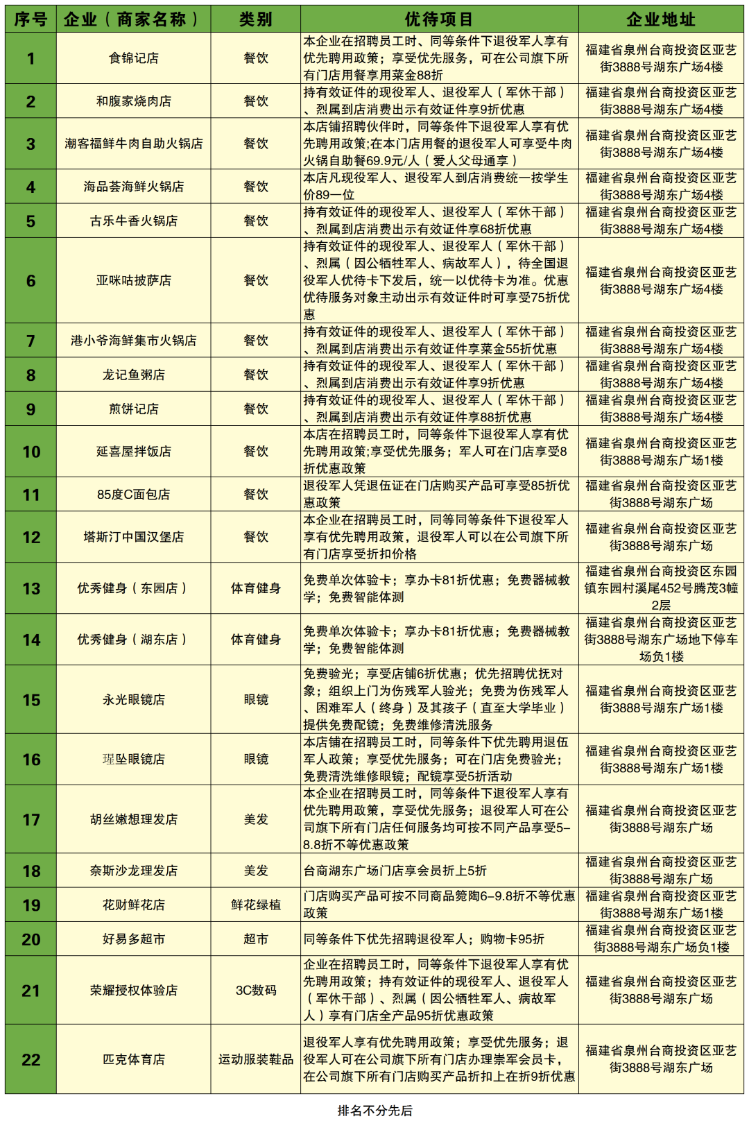 作为泉州台商投资区首个商业综合体拥军示范点,湖东广场“拥军商场”首批汇聚了21家优质商户资源,将为现役、退役军人及其他优抚对象提供“优质产品、优先待遇、优惠价格”的“三优”服务,凡现役、退役军人及其他优抚对象持相关证件,即可享受消费折扣等相关优惠。 首批“拥军门店”清单