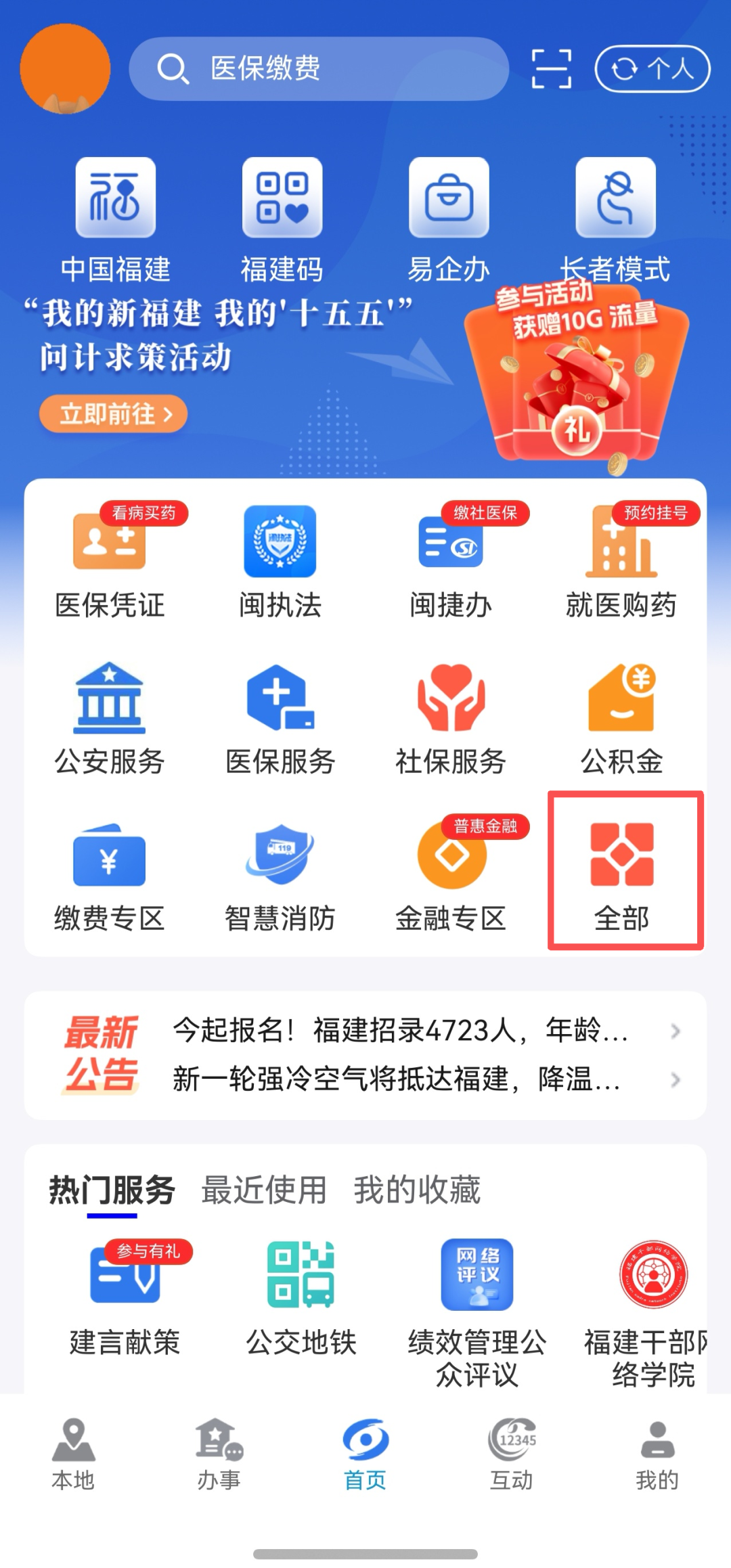 1.打开闽政通App,点击“全部”;