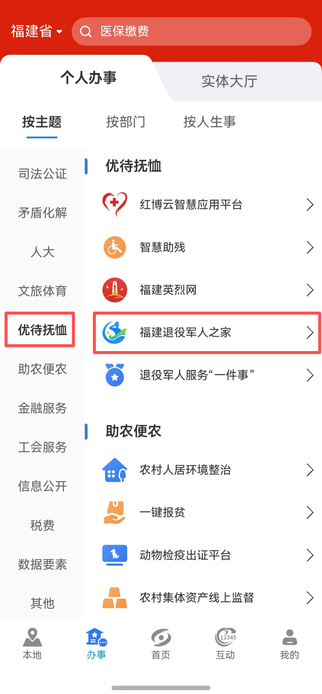 2.在“个人办事”中选择“优待抚恤”,选择“福建退役军人之家”进入退役军人专区;