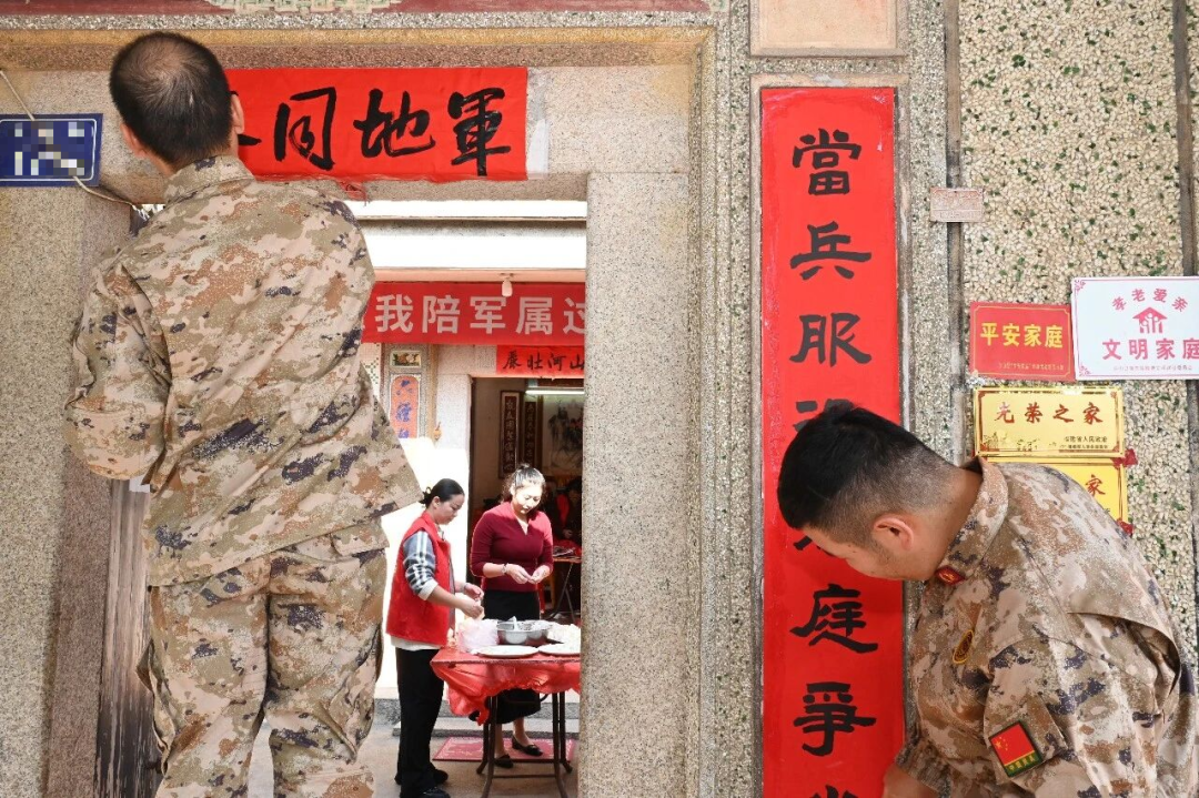 走访人员一进门,便纷纷行动起来:有的悬挂“我陪军属过大年”横幅,有的更换破旧“光荣之家”牌匾,有的张贴红彤彤的福字与春联,院中还挂起了象征团圆的小红灯笼。没多久,小院被点缀得喜气盈盈。